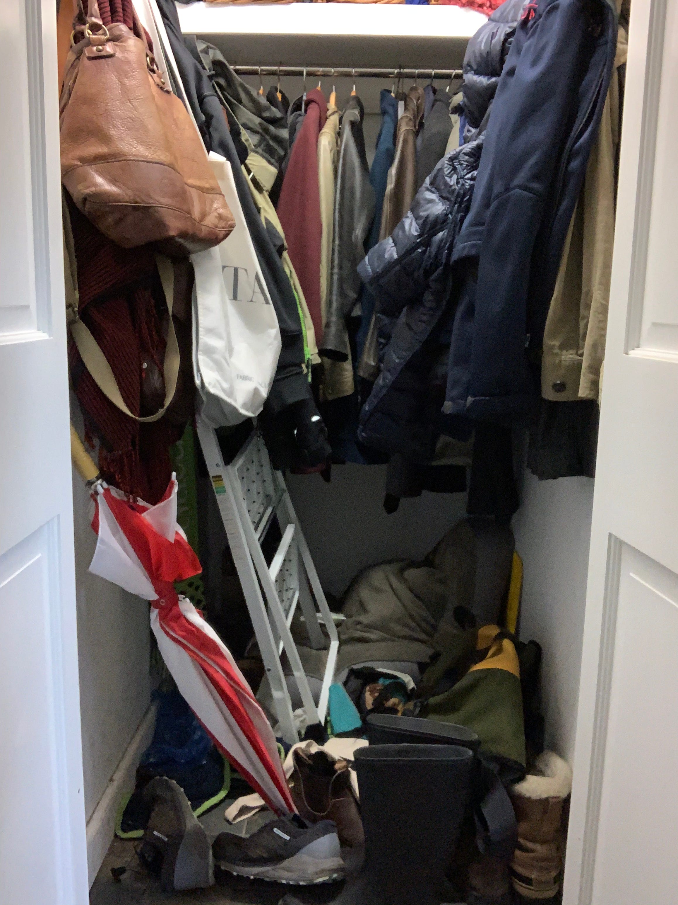 Once upon a time, my front hall closet was an organized place, a place with hooks on the sides and a bar across the back and even a shelf with baskets arrayed on it for storage. But it didn’t stay like that. A bag that was supposed to go on a hook ended up on the floor. Shoes and boots got kicked off into the closet instead of being neatly placed in those super-cool trays you get from IKEA. Coats that came off of hangers went back onto overcrowded hooks instead. Before long, the closet became a mess, a disaster, a testament to the inevitable process of deterioration that is life. The closet became what I call the entropy hotel. This, I tell myself, is where we keep the entropy.